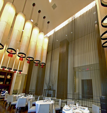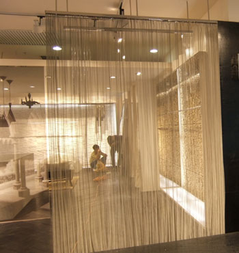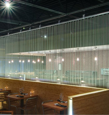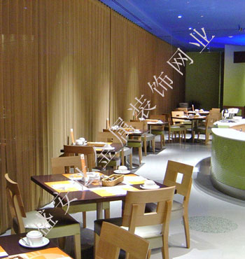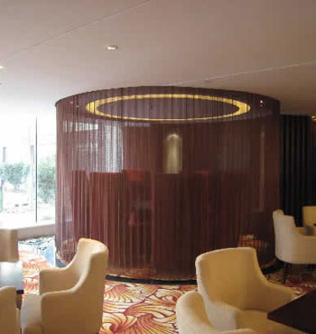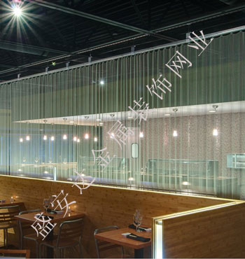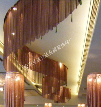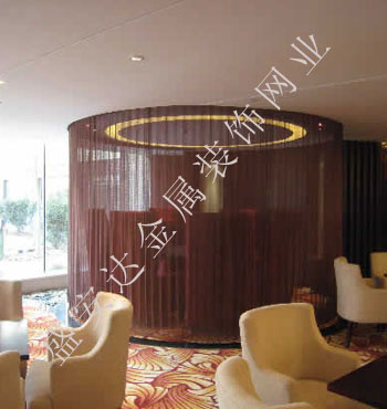 金屬網(wǎng)簾可被應用于大尺寸的割斷或正面裝飾,亦可小面積的局部裝點。其天然金屬色澤隨著光線的不同變化余燈光產(chǎn)生的反射作用,透過金屬網(wǎng),形成一個隔而不斷的整體空間,給人以視覺上的開闊感,想象空間無限。