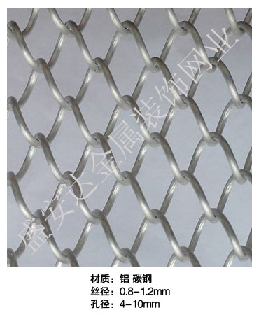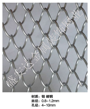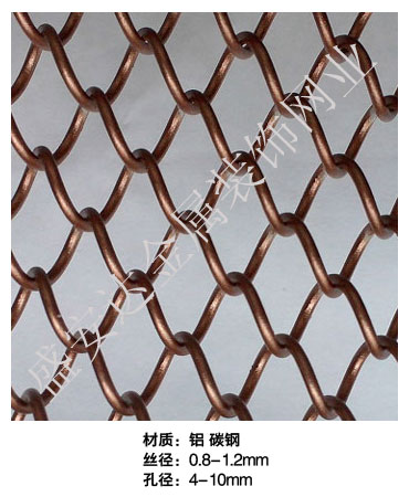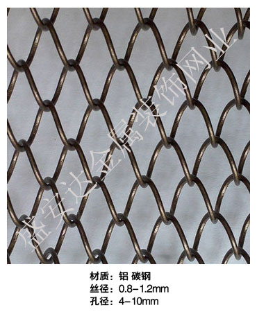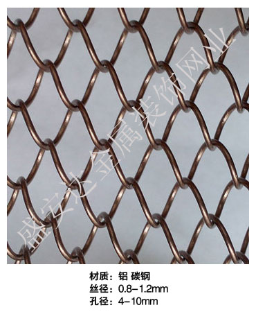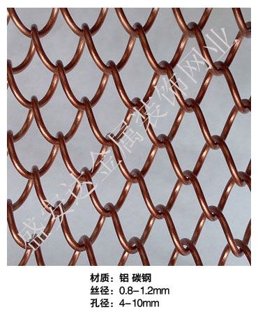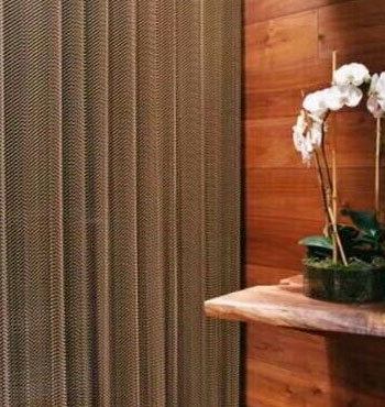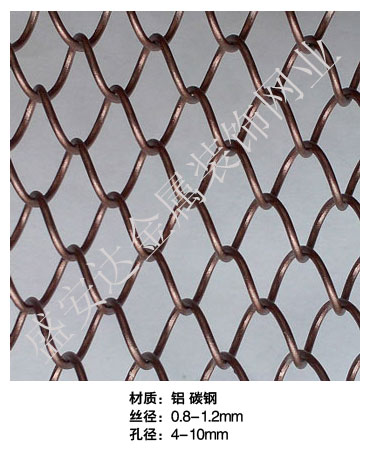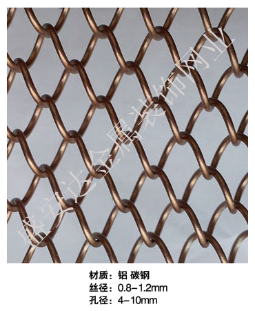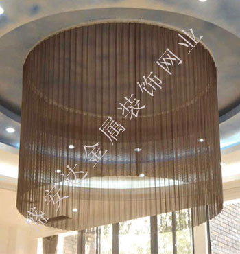金屬網(wǎng)簾----是一種新型建筑裝飾材料,采用優(yōu)質不銹鋼,鋁合金等合金材料,經(jīng)過特殊工藝編制而成,被賦予了傳統(tǒng)布簾所不具有的的折光效果,讓它具有了動感時尚的特點,再加上它的金屬質感的特點,給您的居室頓感典雅氣質非凡個性高貴品位,會使高檔賓館,餐廳,歌劇院,展廳變的富麗堂皇。