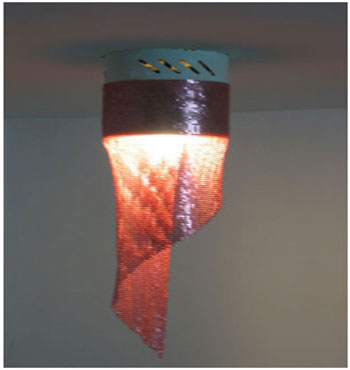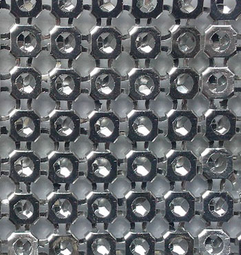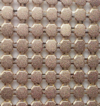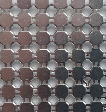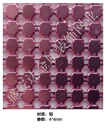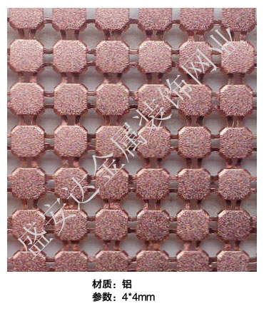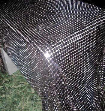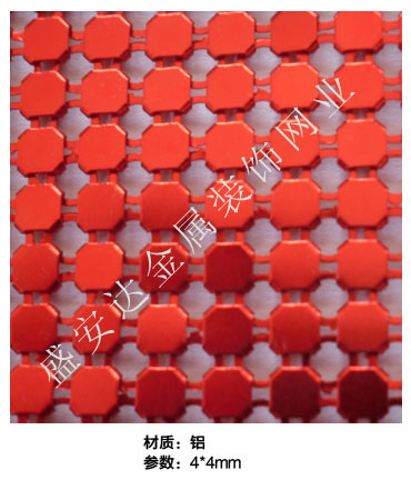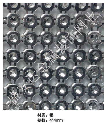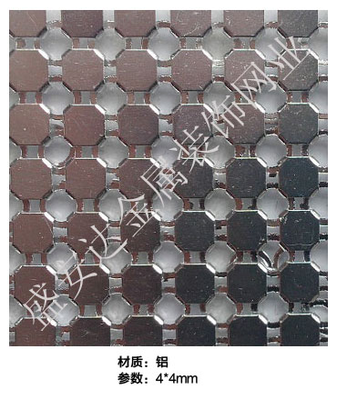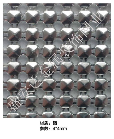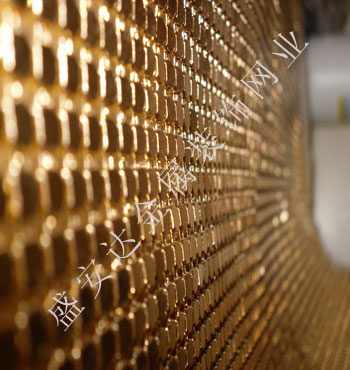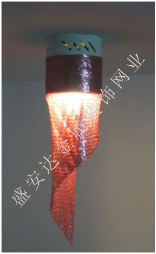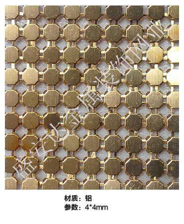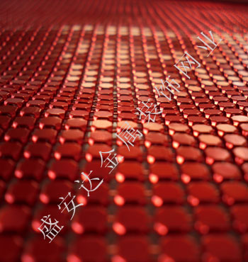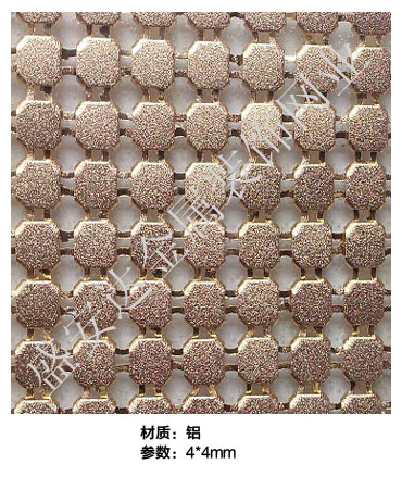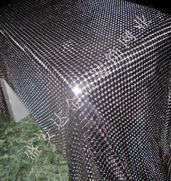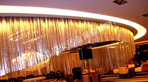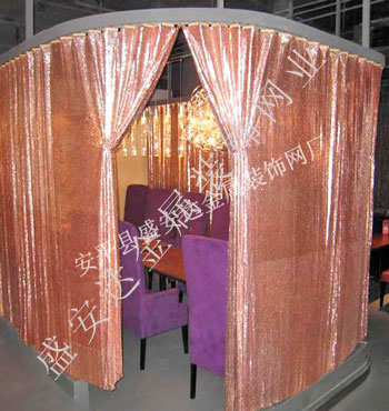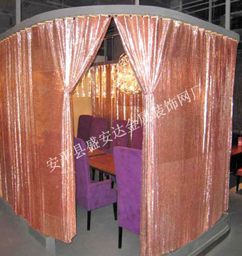 金屬布簾----是多個(gè)鋁網(wǎng)片結(jié)合而成,網(wǎng)片主要樣式有平面,圓珠,梅花和鉆石等形狀,廣泛用于酒店,咖啡廳,音樂(lè)廳,賓館等屏風(fēng)割斷吊頂?shù)龋部捎糜跈淮把b飾,它有著極強(qiáng)的裝飾效果,金屬質(zhì)感的鱗片可以像布一樣可以隨意變動(dòng),在光影變幻之下,顯示出迷人的斑斕色彩,是最新的流行時(shí)尚元素之一。